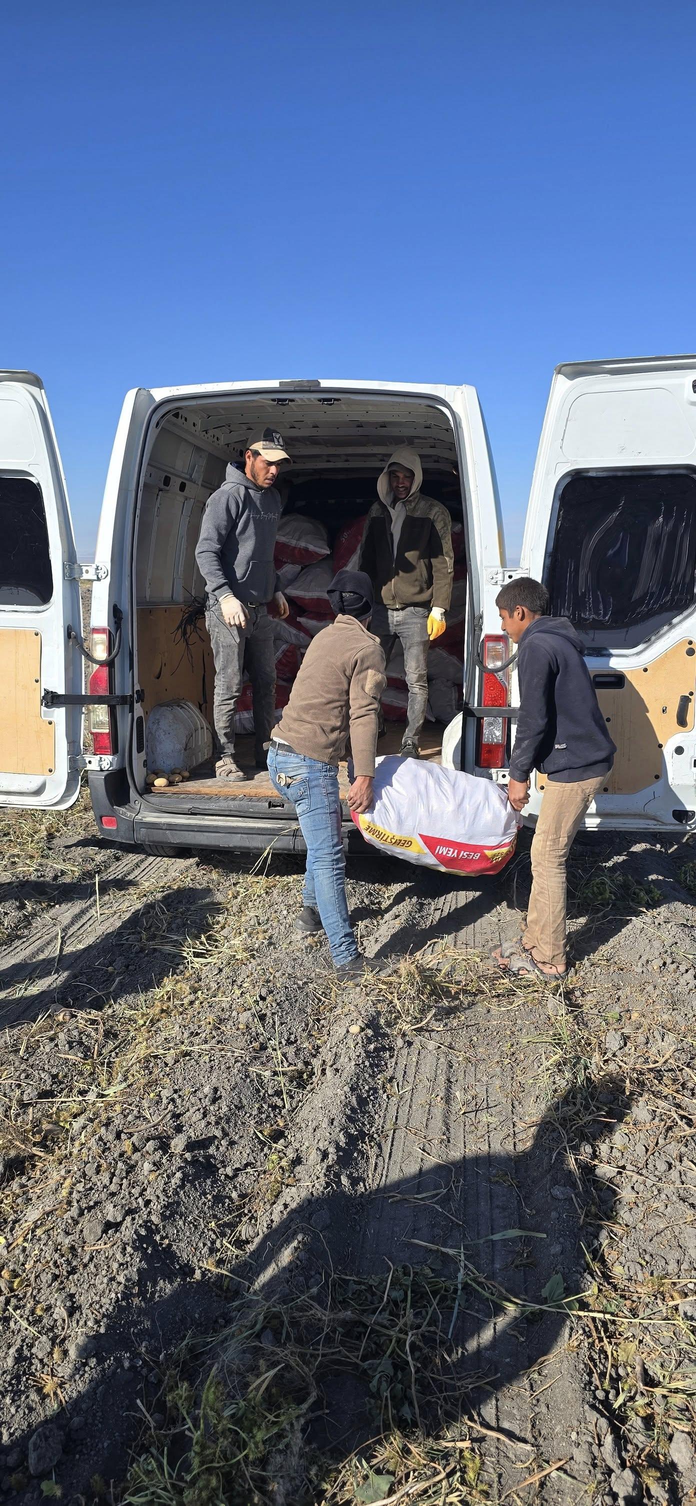 Sürekli olarak bizlere destek olan çiftçi kardeşimiz, takip ettiğimiz her ailemiz için 1 çuval patates olmak üzere toplamda 7 ton patatesi aracımıza yükledi.